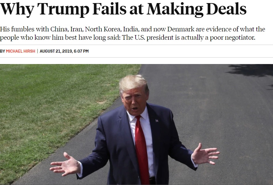 در این مقاله آمده است: از وقتی که دونالد ترامپ در سال ۲۰۱۵ در اقدامی باورنکردنی برای ورود به کاخ سفید نامزد شد، این غول املاک و مستغلات موفق شده آرای مردم آمریکا را به خود جلب کند - حتی بسیار از رای دهندگانی که میدانند شخصیت ترامپ را دوست ندارند - این گونه استدلال میکنند که او مذاکره کنندهای قهار است و میتواند توافقنامهها و قراردادهای تازهای را برای مردم آمریکا به نتیجه برساند.